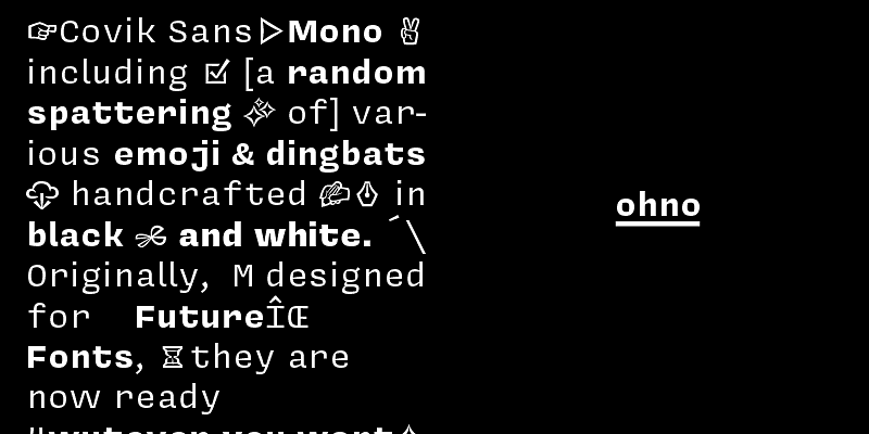 Covik Sans is a neo-grotesque, with a dash of warmth. The seeds of this design were sprouted in James Edmondson's post-graduate studies at TypeMedia, but it wasn’t until years after graduation that it began to truly take shape. The family that results from this long and winding process has the sobriety necessary for corporate systems, but the beating heart one can always expect from Ohno.