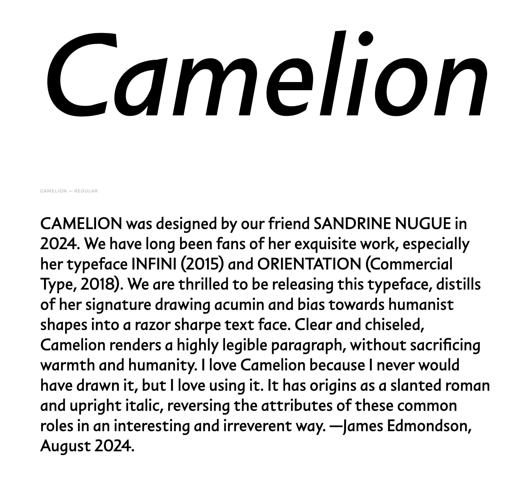 CAMELION was designed by our friend SANDRINE NUGUE in 2024. We have long been fans of her exquisite work, especially her typeface INFINI (2015) and ORIENTATION (Commercial Type, 2018). We are thrilled to be releasing this typeface, distills of her signature drawing acumin and bias towards humanist shapes into a razor sharpe text face. Clear and chiseled, Camelion renders a highly legible paragraph, without sacrificing warmth and humanity. I love Camelion because I never would have drawn it, b...